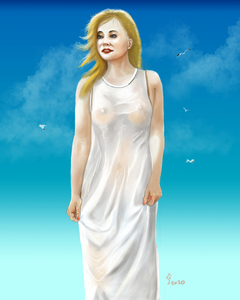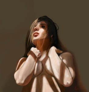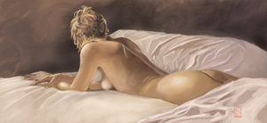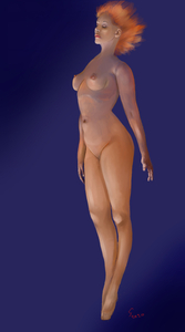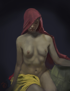 Dit werk begon als een uitdaging. Het is gebaseerd op een onvoltooid schilderij van Renato Ferrari, dat ik op internet vond. Het was een WIP (work in progress) en alleen het hoofd en een van de benen was door Renato ingevuld. De romp was alleen een schets.