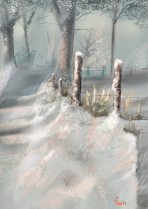 2013De zon, de sneeuw, de schaduwen. Digitaal geschilderd in gloobtechniek, afgedrukt op 3 mm dik aluminium dibond. (Het werk heeft meegedaan aan de expositie in Galerie Hoeve Rijlaarsdam. De expositie vond plaats van zaterdag 12 oktober tot en met vrijdag 8 november 2013. Het werk hing tot 5 september 2014 in het Augustinusklooster in Nijmegen. Het werk hing 12 en 13 september op de |nternational Art Fair 2014 in Rotterdam.) Dit werk is aanwezig op de culturele markt van De Peelse Golf op 29 mei 2016.
