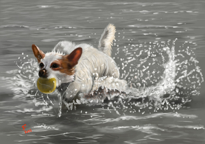 2013Marscha gaat er vandoor achter een bal aan. Een explosie van kracht en concentratie. Digitaal geschilderd in olieverftechniek afgedrukt op 3 mm dik dibond. (Dit werk was aanwezig op de culturele markt van De Peelse Golf op 29 mei 2016.)